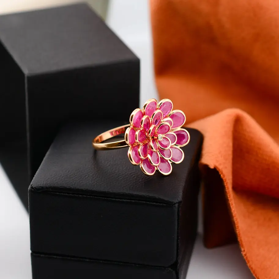 Elegant 18K solid gold floral ring featuring vibrant pink natural gemstones arranged in a blooming flower design. A lightweight statement ring perfect for everyday luxury or special occasions.